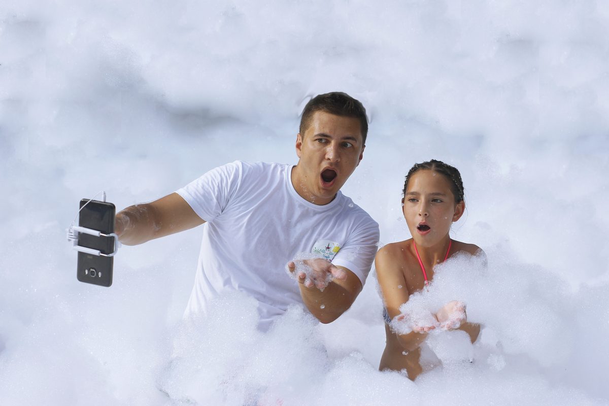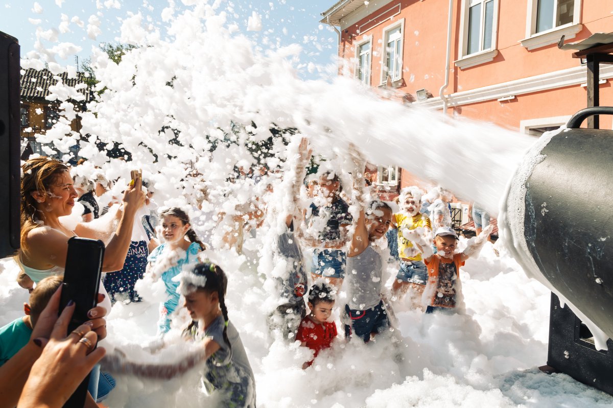 Облако безвредной пены (сертифицированная, гипоаллергенная) из пенных пушек “различного калибра”. Пенная вечеринка, которая не оставляет следов после высыхания.